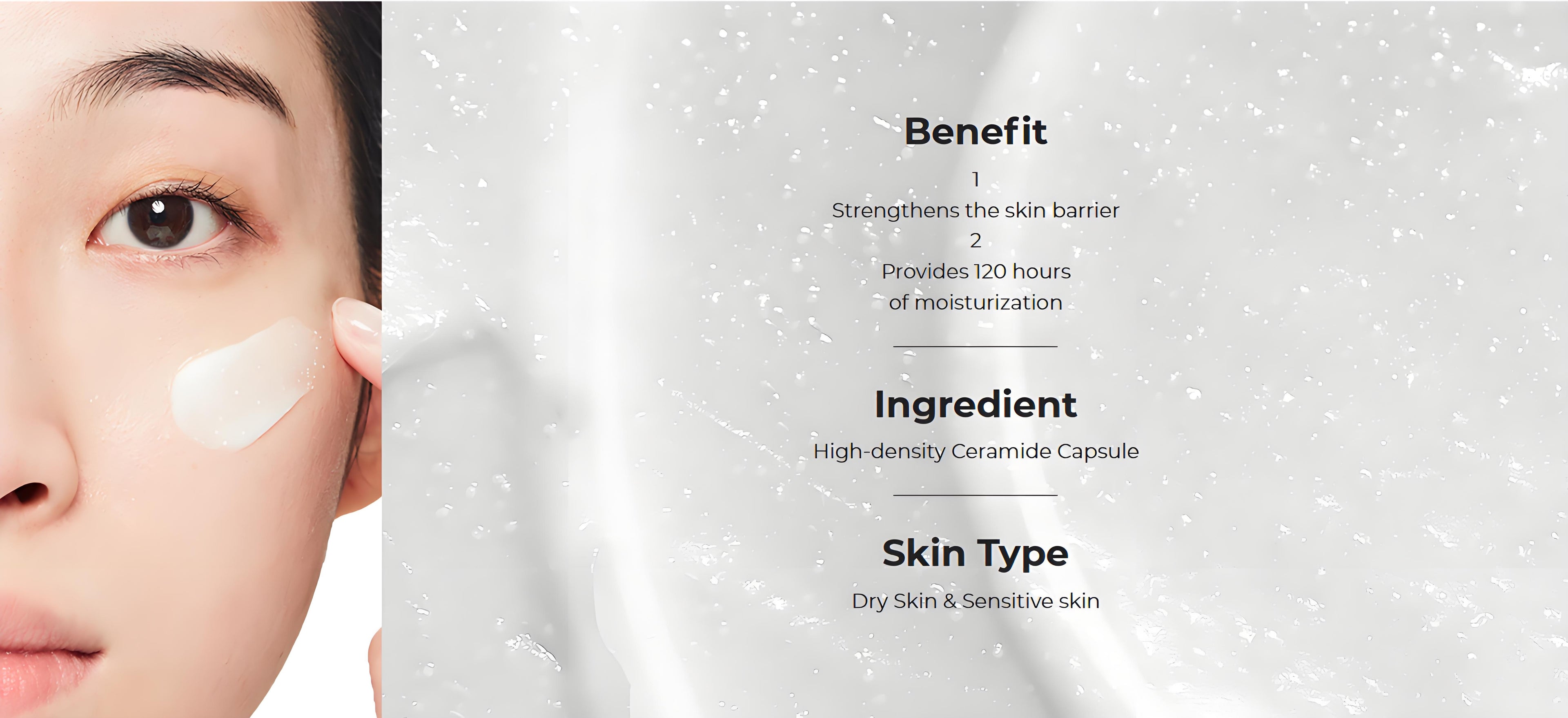 Through 40 years of dedicated research on sensitive skin, we have applied high-density ceramide capsules specifically designed for sensitive skin. We discovered that sensitive skin has shorter and fewer ceramides, leading to barrier gaps that cause dryness. Our product contains long and finely-packed ceramides, particularly suited for sensitive skin, along with essential lipid components for the skin. Additionally, we have applied patented capsule technology to ensure that the ceramides remain in the barrier for an extended period and can help repair damaged barriers. This technology demonstrated that the ceramides retained 190% more after cleansing compared to non-capsule formulations.