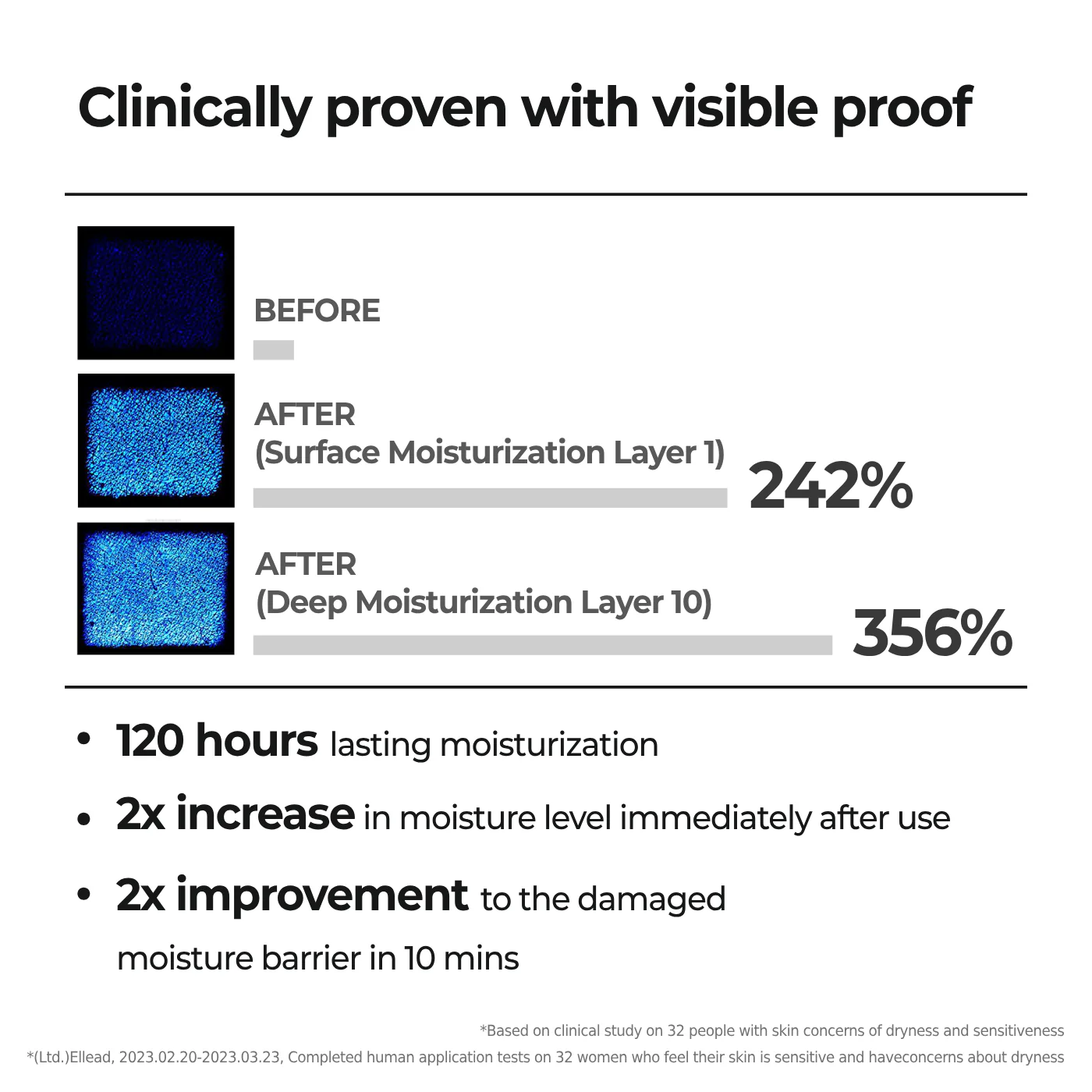 *(Ltd.)Ellead, 2023.02.20-2023.03.23, Completedhuman application tests on 32 women who feel their skin is sensitive and haveconcerns about dryness